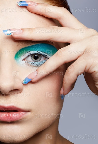 Женский глаз с макияжем в голубых тонах и с красивым маникюром