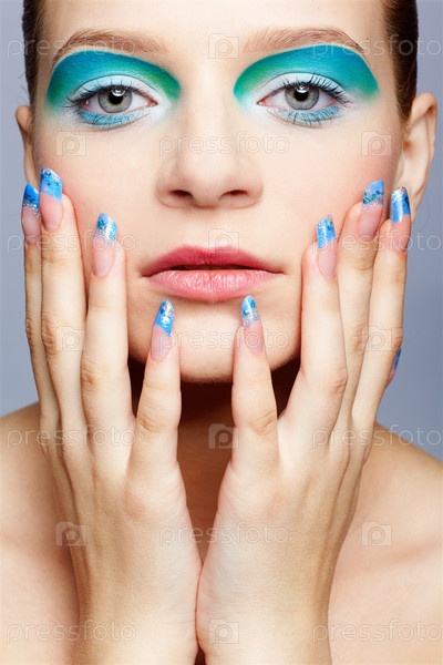 Портрет красивой девушки с макияжем и маникюром в голубых тонах