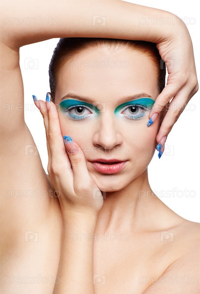 Портрет красивой девушки с макияжем и маникюром в голубых тонах