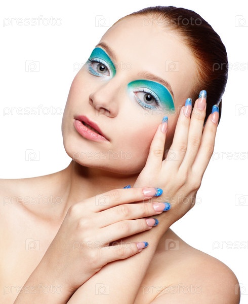 Портрет красивой девушки с макияжем и маникюром в голубых тонах