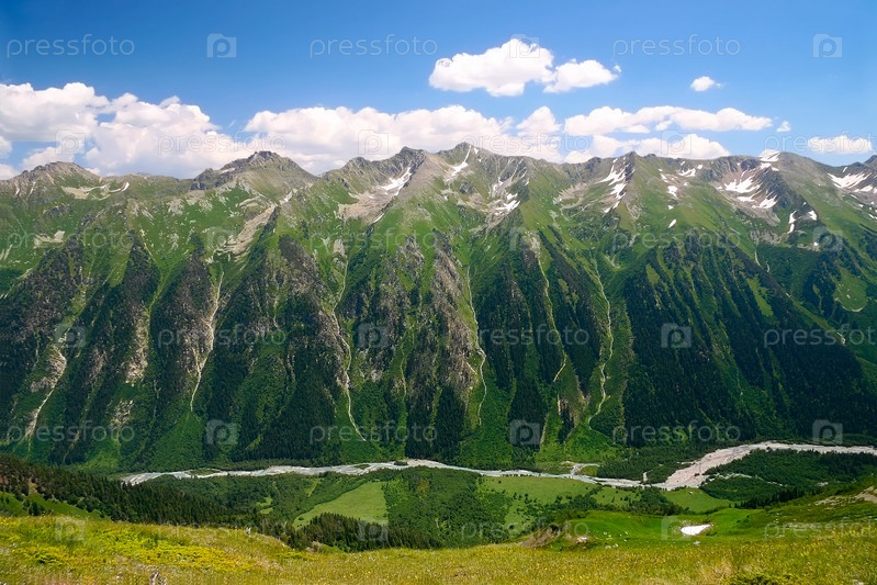 Горная цепь Кавказа на фоне голубого облачного неба