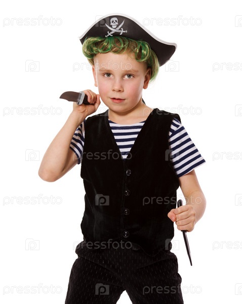 Маленький мальчик в костюме пирата на белом фоне