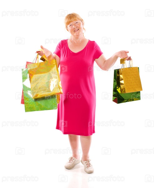 Женщина в годах с подарочными пакетами на белом фоне