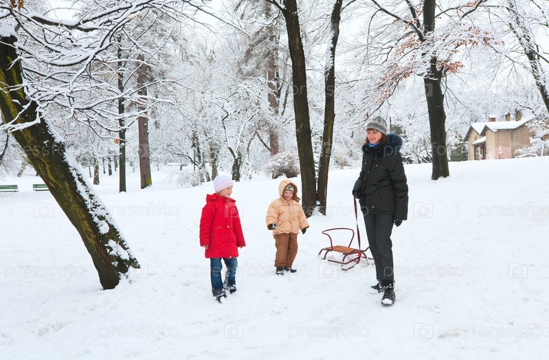 Счастливая мама с детьми в городском парке