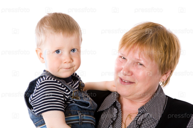 Счастливая бабушка с внуком на белом фоне
