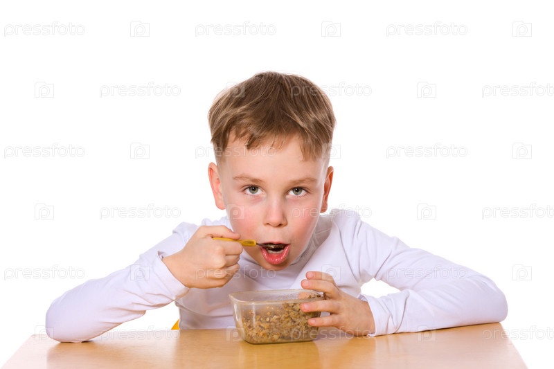 Маленький мальчик, завтракающий за столом на белом фоне