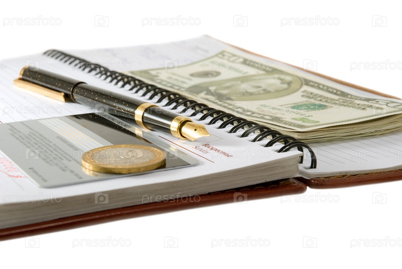 Черная ручка, монета, банковская карта, пачка долларов на открытом ежедневнике на белом фоне