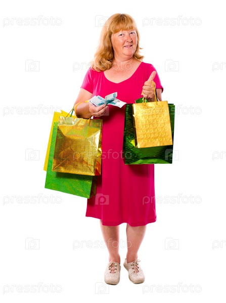 Пожилая женщина с разноцветными пакетами на белом фоне