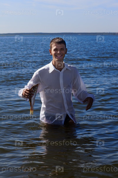 Мужчина в белой рубашке стоит в воде с рыбой в руке