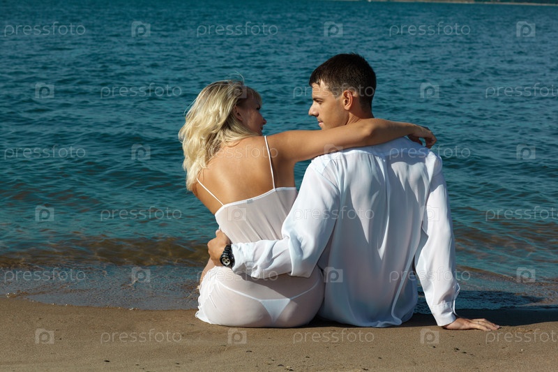 Молодая пара сидит на берегу моря и смотрит друг на друга
