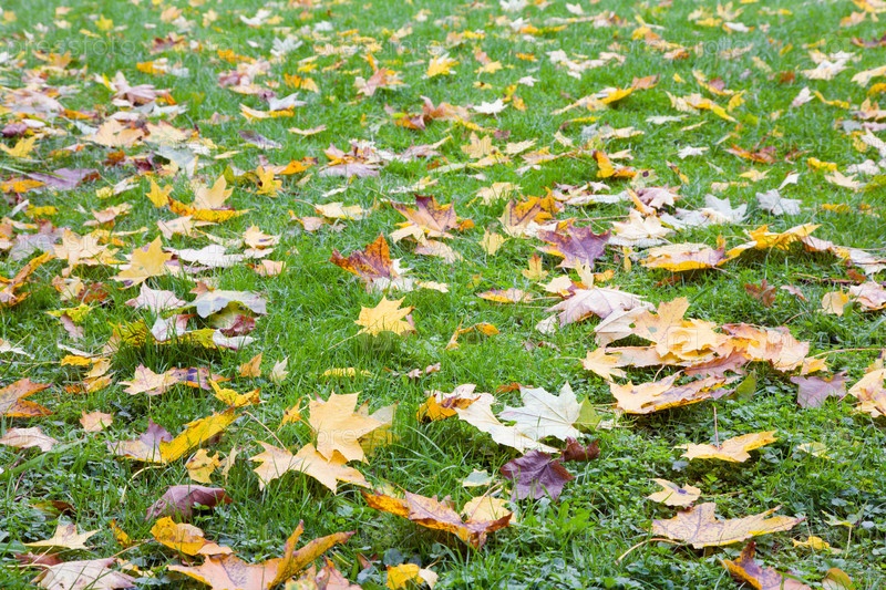Осенняя листва на фоне зеленой травы