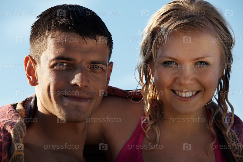 Молодая пара с мокрыми волосами позирует на пляже