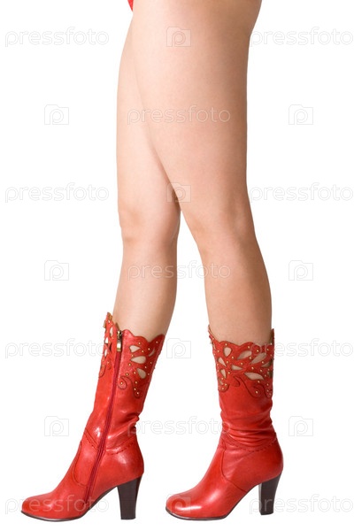 Женские ноги в красных сапогах на белом фоне