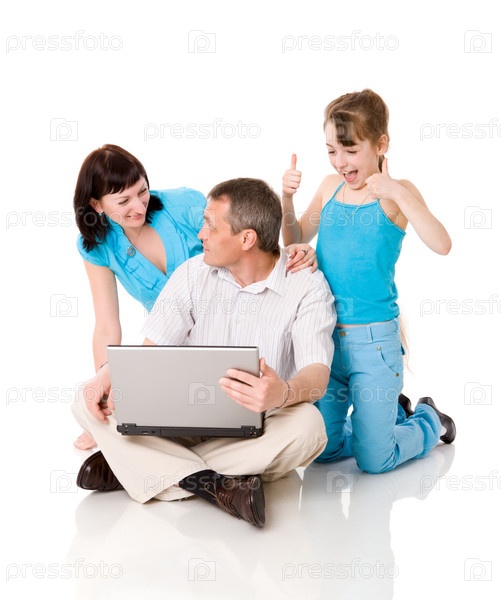 Семья с ноутбуком на белом фоне