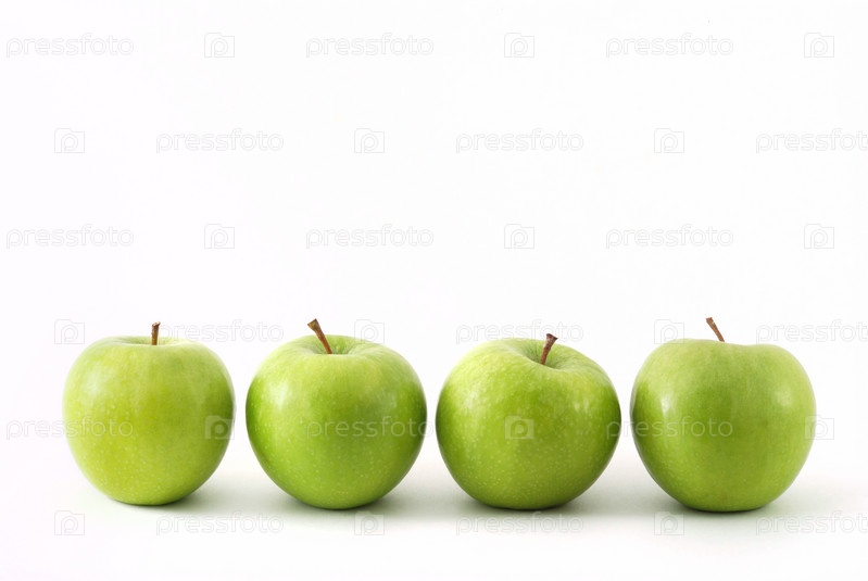 Четыре зеленых яблока на белом фоне