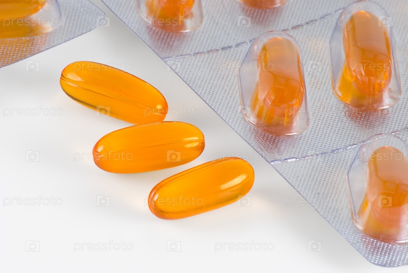 Желтые таблетки в капсулах на белом фоне