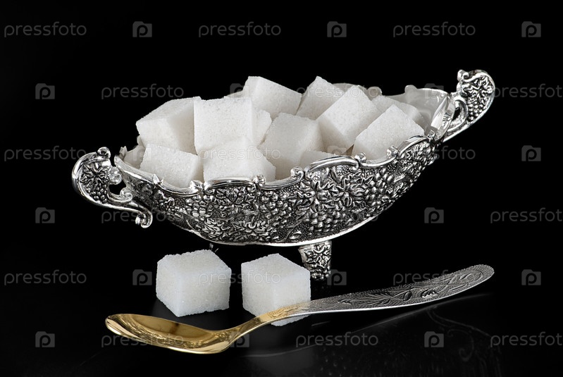 Сахар-рафинад в серебряной вазе, два кусочка сахара и серебряная ложка на черном фоне