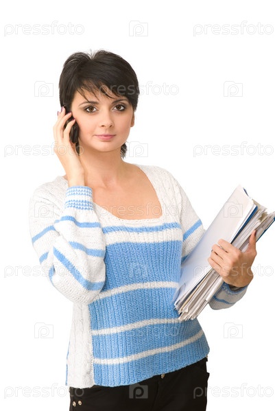 Девушка в бело-синем свитере и черных брюках держит папку с документами и говорит по телефону на белом фоне