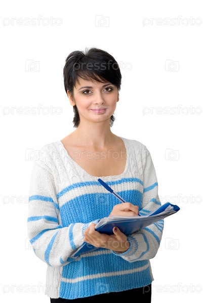 Девушка в бело-синем свитере держит синюю папку с документами и шариковую ручку на белом фоне