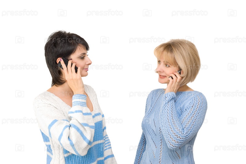 Две женщины говорят по телефону на белом фоне