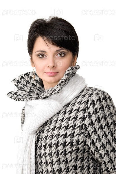 Девушка в клетчатом пальто с белым шарфом на белом фоне