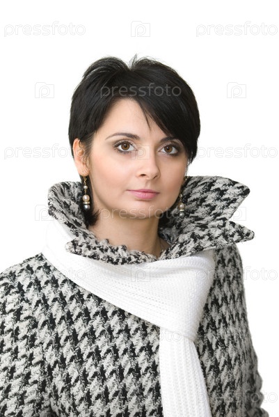 Девушка в клетчатом пальто с белым шарфом на белом фоне