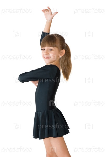 Девочка в черном платье балерины в танцевальной позе на белом фоне