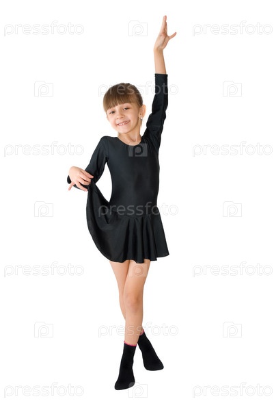 Девочка в черном платье балерины в танцевальной позе на белом фоне