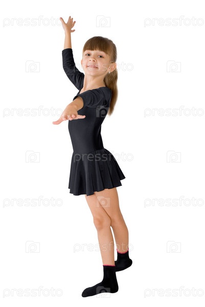 Девочка в черном платье балерины в танцевальной позе на белом фоне