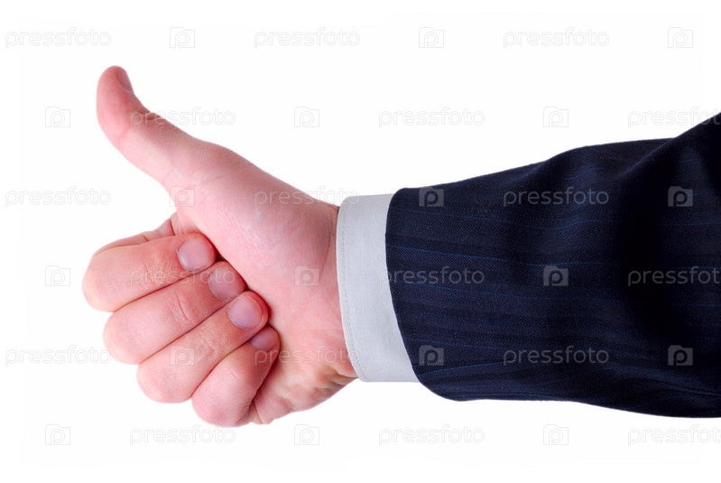 Мужская рука в деловом костюме на белом фоне показывает большой палец вверх