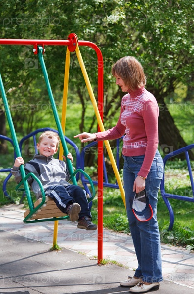 Счастливая мама качает сына на качелях в парке
