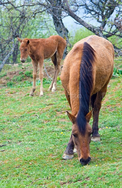 Лошадь с жеребенком на горном холме