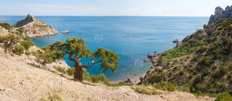 Прибрежные скалы с зеленым деревом у Черного моря на фоне голубого неба