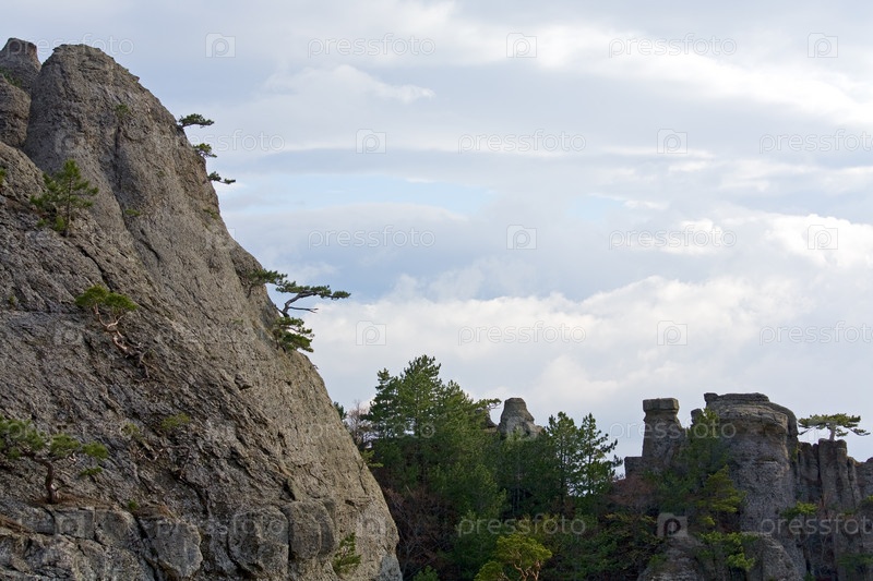 Скалистые горы и хвойные деревья на фоне облачного неба
