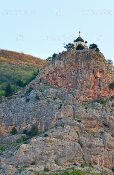 Церковь на вершине скалы на рассвете на фоне голубого неба