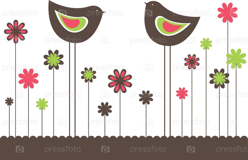 Красивая открытка с птицами и цветами на белом фоне