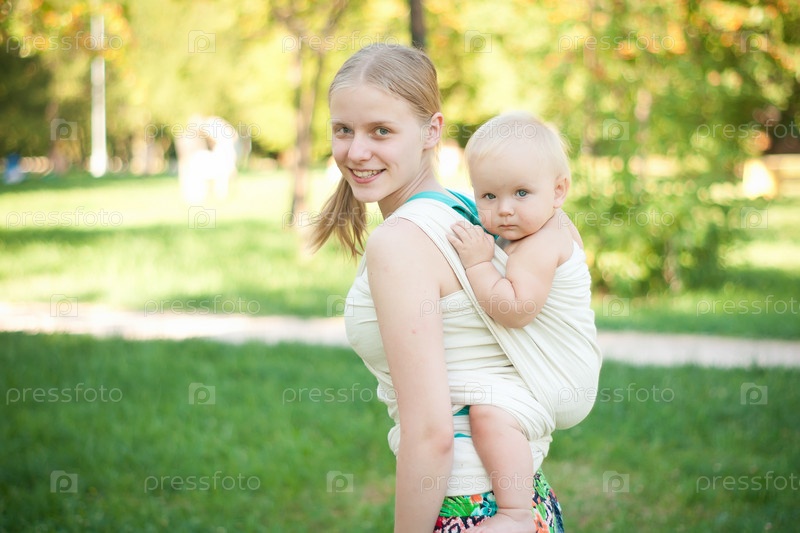 Портрет молодой мамы с ребенком на спине в парке
