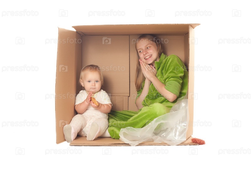 Веселая мама с дочерью сидят в картонной коробке на белом фоне