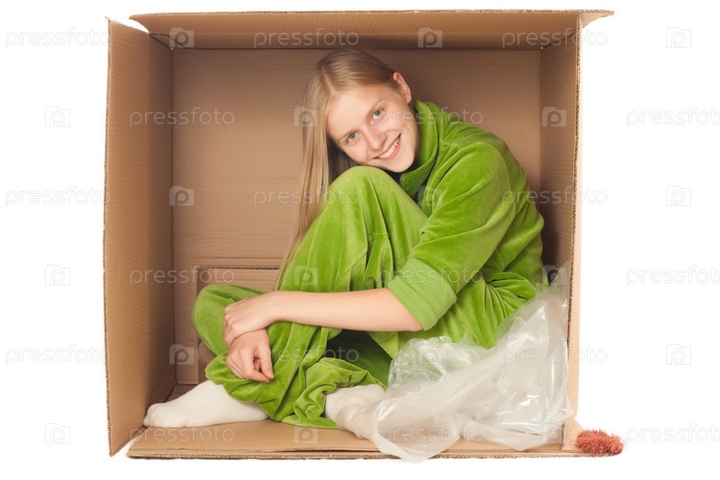 Портрет очаровательной девушки в картонной коробке на белом фоне