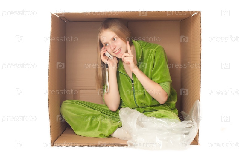 Молодая девушка в картонной коробке разговаривает по мобильному телефону