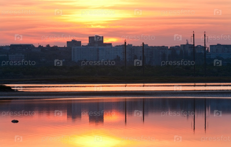 Город Щелкино отражается на гладкой поверхности воды на фоне красного от заката неба