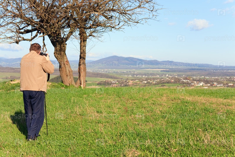Мужчина со штативом на зеленой поляне фотографирует одинокое дерево без листьев на фоне Карпатских гор и голубого неба