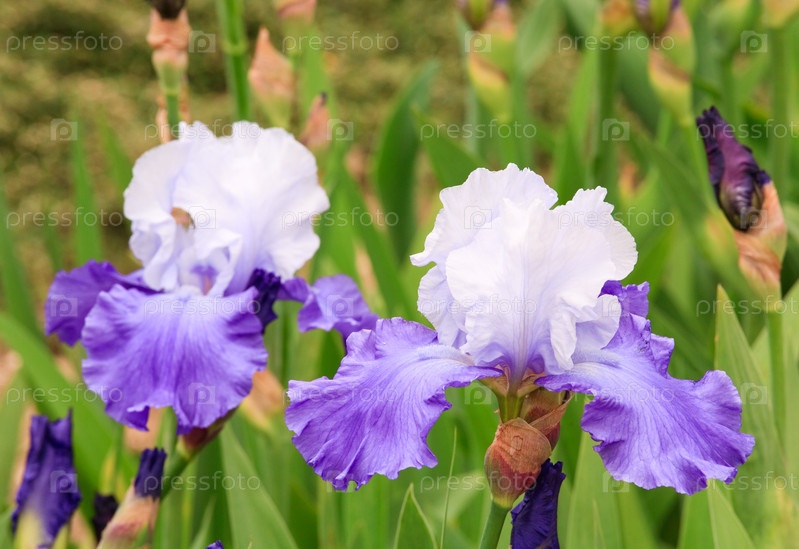 Фиолетово-синий и белый ирис на цветочной клумбе крупным планом