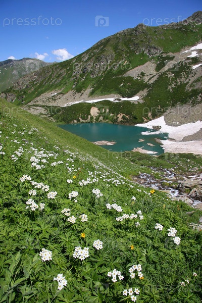 Белые цветы среди зеленой травы в горах Кавказа у реки под голубым небом