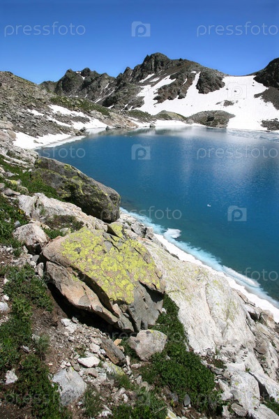 Высокогорное озеро и горные камни, покрытые зеленым мхом, под синим небом