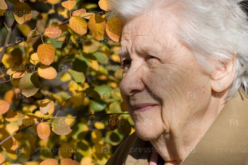 Портрет пожилой женщины на фоне осенних листьев крупным планом