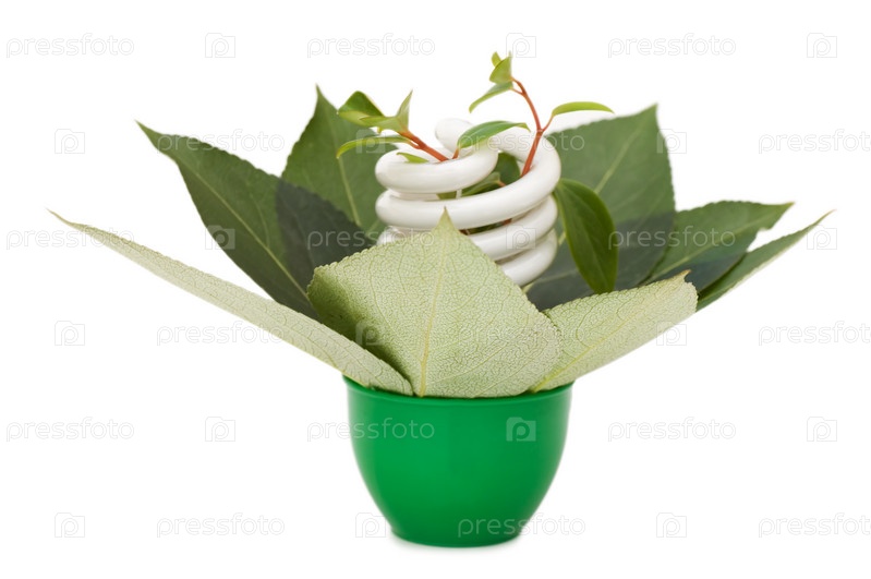 Энергосберегающая лампа и зеленые листья на белом фоне