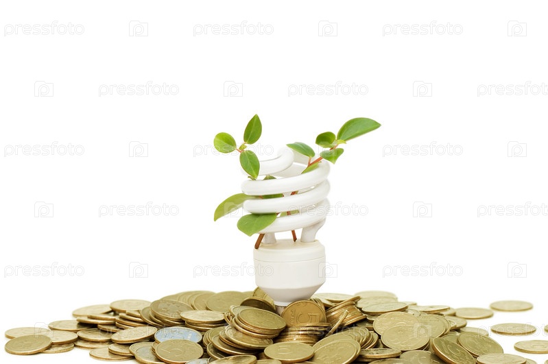 Энергосберегающая лампа и гора монет на белом фоне