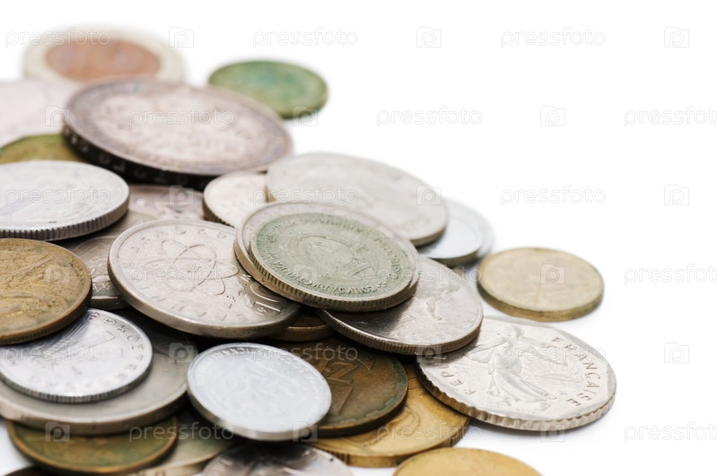 Старые монеты на белом фоне крупным планом
