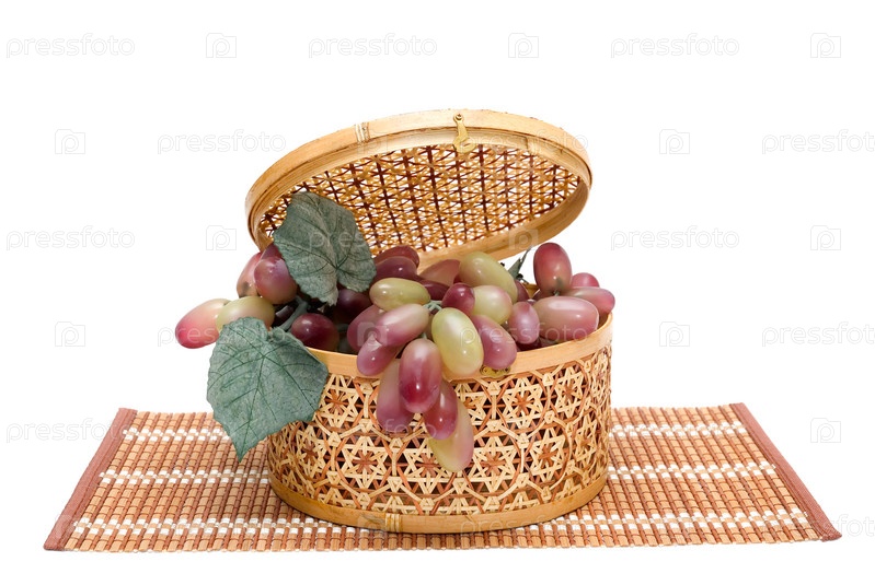 Желтая плетеная корзина с ягодами и листьями винограда на коричневой плетеной скатерти на белом фоне